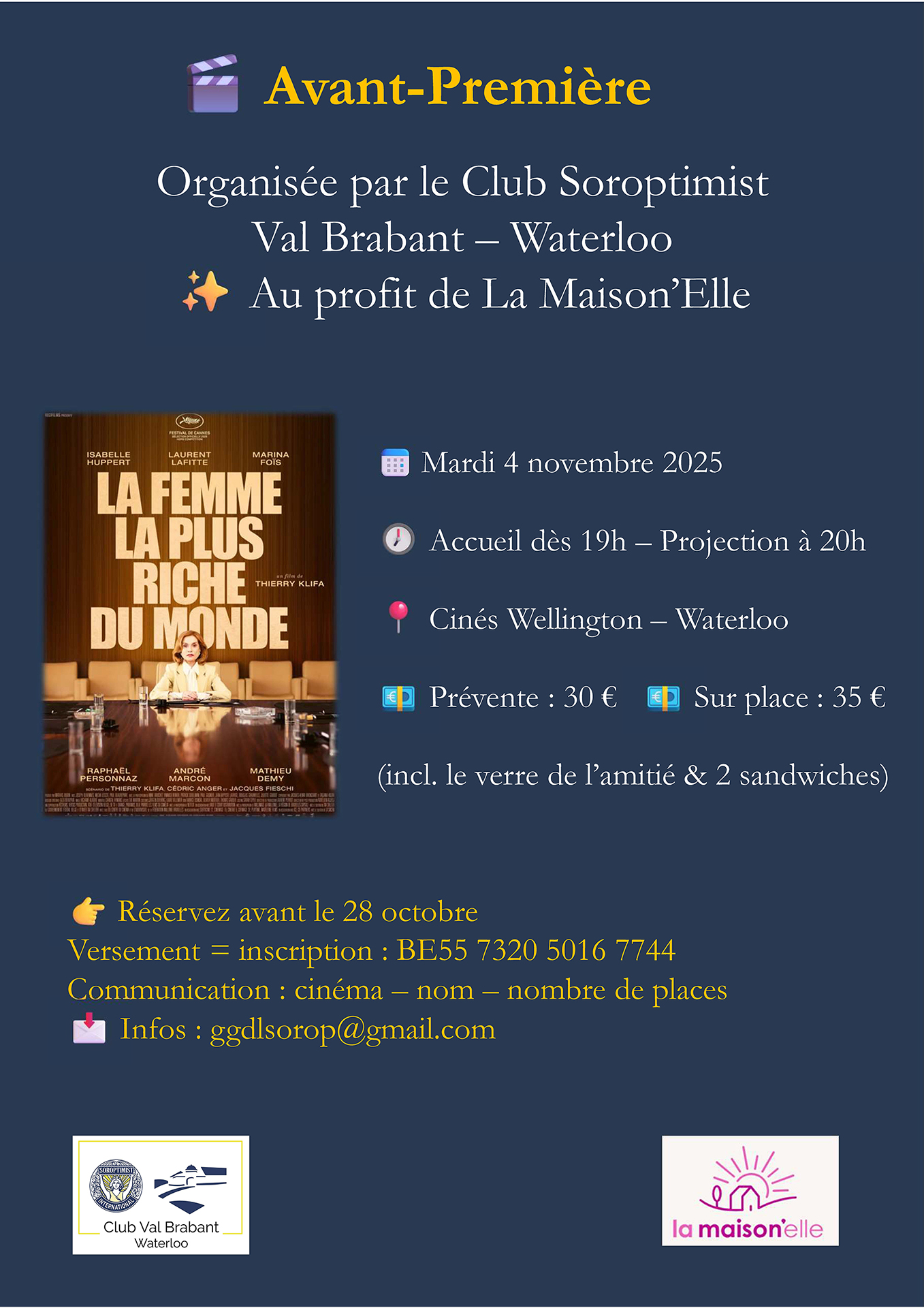 Cette année nous avons choisi le film "La Femme la plus riche du monde" pour notre gala de cinéma. Tous les détails (heure, prix, contact,...) sur l'affiche jointe.  Bloquez vos agenda!