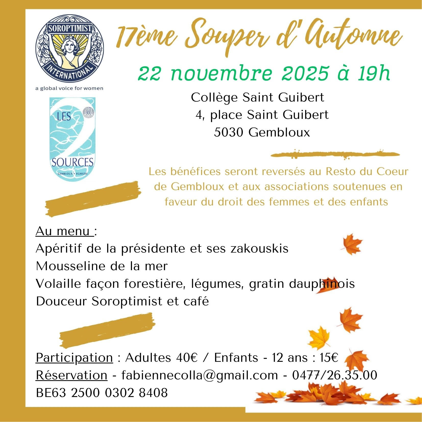 Les bénéfices seront reversés au Resto du Coeur de Gembloux et aux associations soutenues en faveur du droit des femmes et des enfants