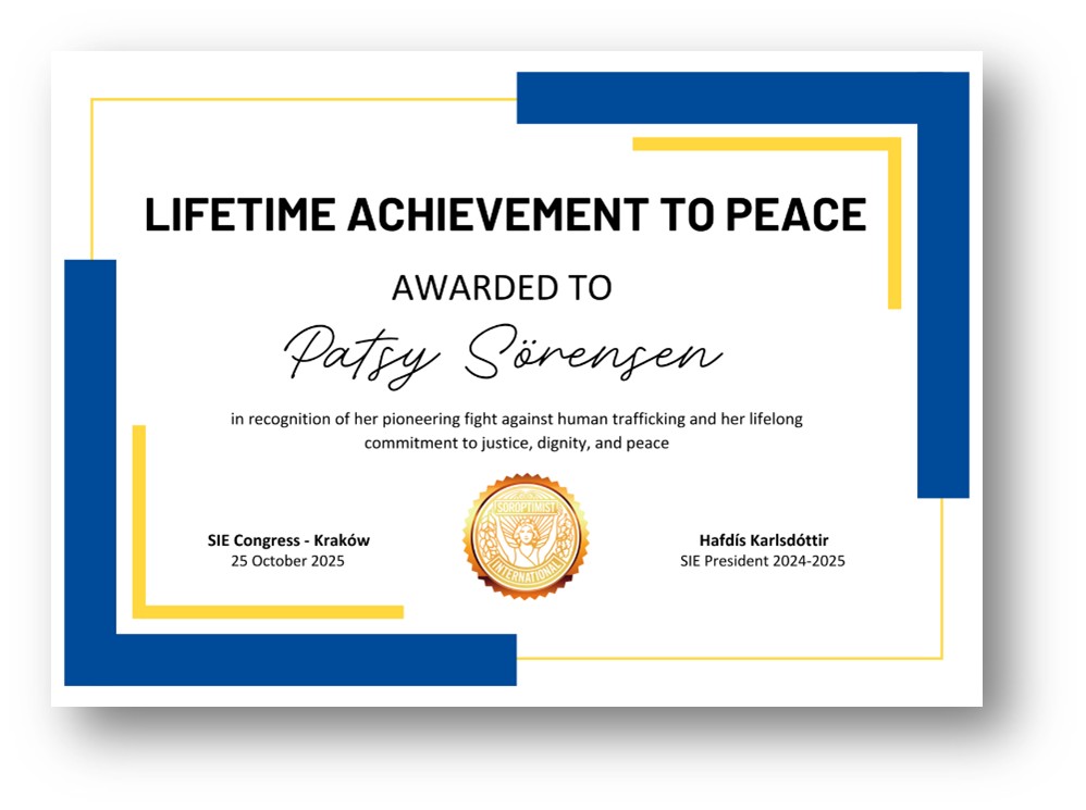 Patsy Sörensen reçoit le Soroptimist International Europe LIFETIME ACHIEVEMENT OF PEACE : une vie consacrée à la lutte contre la traite des êtres humains.