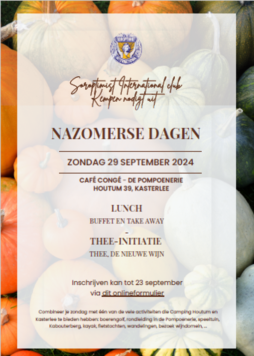 Veuillez indiquer votre participation et votre choix à confirmer en déposant le montant sur le compte du Soroptimist Int. Club Kempen BE26 7330 7559 2029 en indiquant votre nom et votre choix.